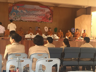 Once no more selfies could be taken and the director was ready to start, we walked into the hall. All the students were standing and in a deep wai (a bow - which is a sign of respect) and had formed an aisle for us to walk down. We walked up on the stage and were seated. The director walked over to the Buddha statue and paid respects to the Buddha.